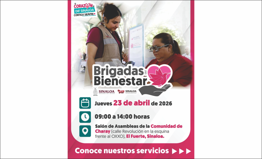 Culiacán, Sinaloa, a 21 de abril de 2026.– Con el compromiso de acercar atención directa y mejorar la calidad de vida de las familias sinaloenses, el Gobierno del Estado y el Sistema DIF Sinaloa invitan a la población de la comunidad de Charay, en el municipio de El Fuerte, a aprovechar los servicios gratuitos de las Brigadas del Bienestar.